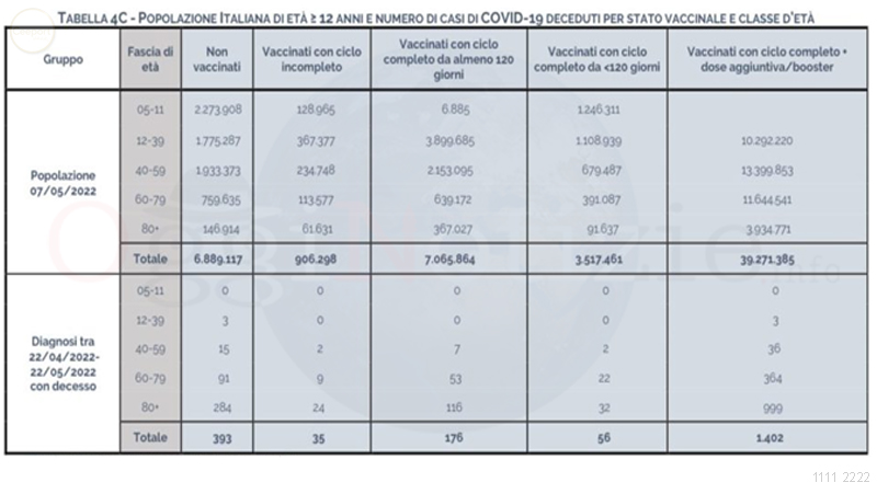 L’Iss (Istituto Superiore di Sanità) ha pubblicato l’ultimo “Report esteso” (se sparisce scaricalo da qui) in data 17 giugno 2022. I dati contenuti al suo interno sono la pietra tombale sulla narrazione a senso unico sull’efficacia del vaccino. Decessi, ricoveri in terapia intensiva e fasce d’età rivelano infatti quello che noi diciamo da mesi: le cose non stanno come vogliono farci credere. E ora sono i numeri a certificarlo. La lettura di questi dati è esclusiva, perché nessuno ha voluto dare finora questa interpretazione. Ma procediamo con ordine. Specifica l’Iss: “Questo report è prodotto dall’Istituto Superiore di Sanità (ISS) e riporta i dati della sorveglianza integrata dei casi di infezione da virus SARS-CoV-2 segnalati sul territorio nazionale, coordinata dall’ISS ai sensi dell’Ordinanza n. 640 del 27 febbraio 2020. Le informazioni contenute derivano da tutti i casi di infezione da virus SARS-CoV-2 che sono stati confermati tramite test molecolari e antigenici dalle Regioni e Province Autonome e segnalati al sistema di sorveglianza attraverso una piattaforma web dedicata. Il database nazionale si compone, pertanto, della somma dei casi presenti nei 21 sistemi informativi di Regioni e PPAA che sono stati sviluppati ad hoc per la sorveglianza COVID-19”. E ora diamo uno sguardo ai numeri…