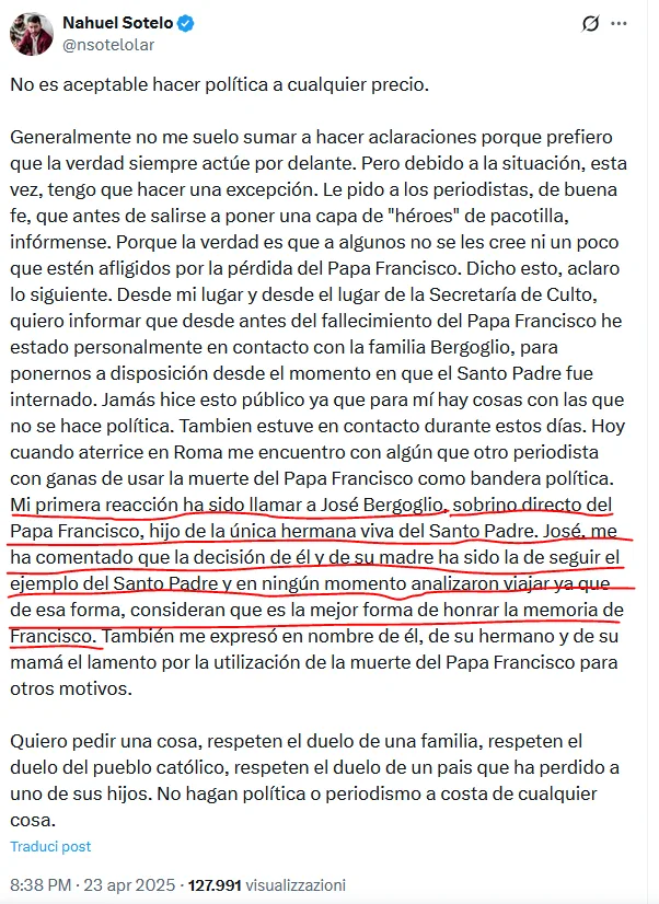 Nella presidenza argentina esiste un ufficio dedicato ai rapporti con la Chiesa Cattolica e le altre religioni, ed è quello della Secretaría de Culto y Civilización, presieduta da Nahuel Sotelo.