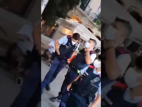 In Spagna, i poliziotti cercano di trattenere una donna per non aver indossato la mascherina. Una dozzina di persone buttano via le mascherine e lottano con la signora dalle loro prese.