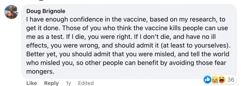 Le sue parole ed i suoi post stanno facendo un tam tam in rete, perché la vicenda dello sportivo, icona del bodybuilding è davvero un’immagine di salute e nessuno si sarebbe aspettato che “la prova” che lui aveva deciso di fare per dimostrare a tutti che il vaccino ci protegge sarebbe poi finita in questo modo. Sicuramente non ci avrebbe scommesso nemmeno lui che credeva fermamente nella ricerca scientifica e infatti scrisse su facebook: “Quelli di voi che credono che il vaccino uccida le persone può usarmi come test. Se muoio, avevi ragione. Se non muoio e non ho conseguenze sulla salute, vi sbagliavate e dovreste ammetterlo (almeno a voi stessi). O meglio ancora, dovresti ammettere di essere stato fuorviato e dire al mondo chi ti ha ingannato, in modo che altre persone possano trarre vantaggio dall’evitare questi spauracchi.”