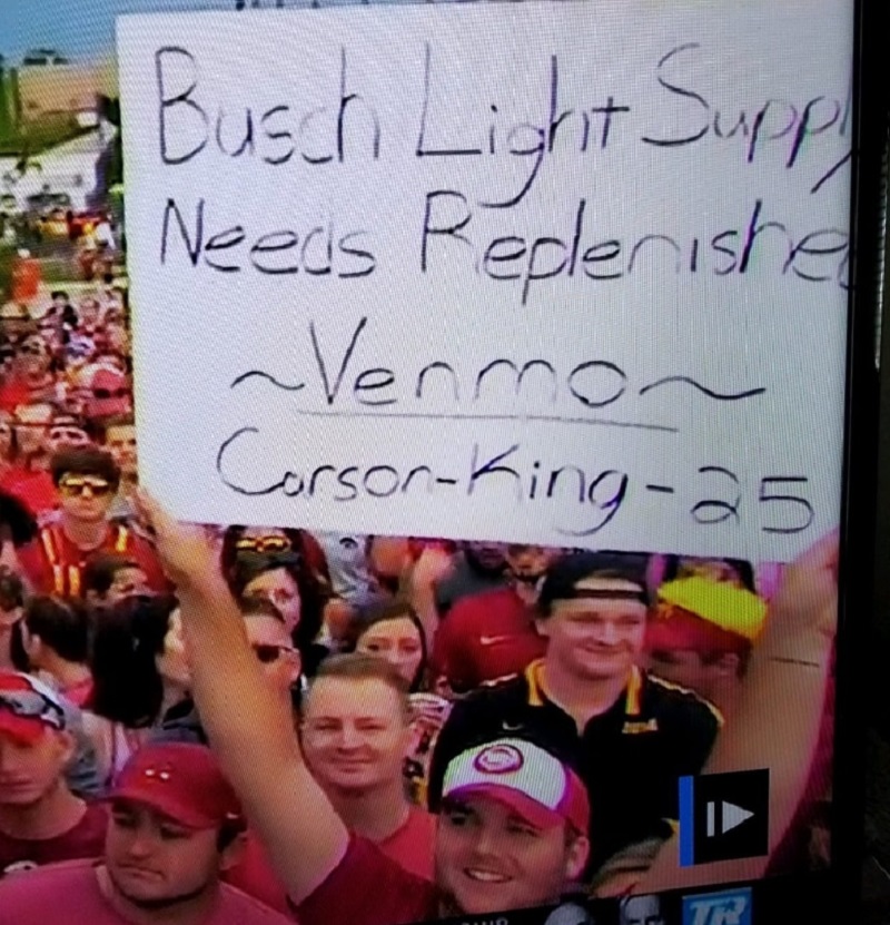Si è presentato con un cartello in una partita di football in Iowa chiedendo aiuto per rifornirsi di una birra locale, la Busch Light indicando dove mandare i soldi.