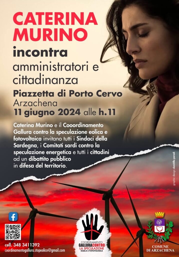 Martedì 11 giugno alle ore 11, nella Piazzetta di Porto Cervo di Arzachena, l’attrice Caterina Murino e il Coordinamento Gallura contro la speculazione eolica e fotovoltaica invitano tutti i Sindaci della Sardegna, i Comitati sardi contro la speculazione energetica e tutti i cittadini a un dibattito pubblico in difesa del territorio.
