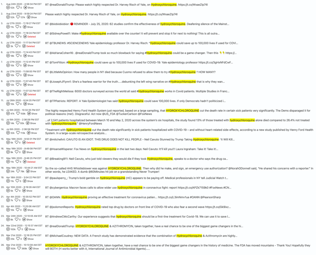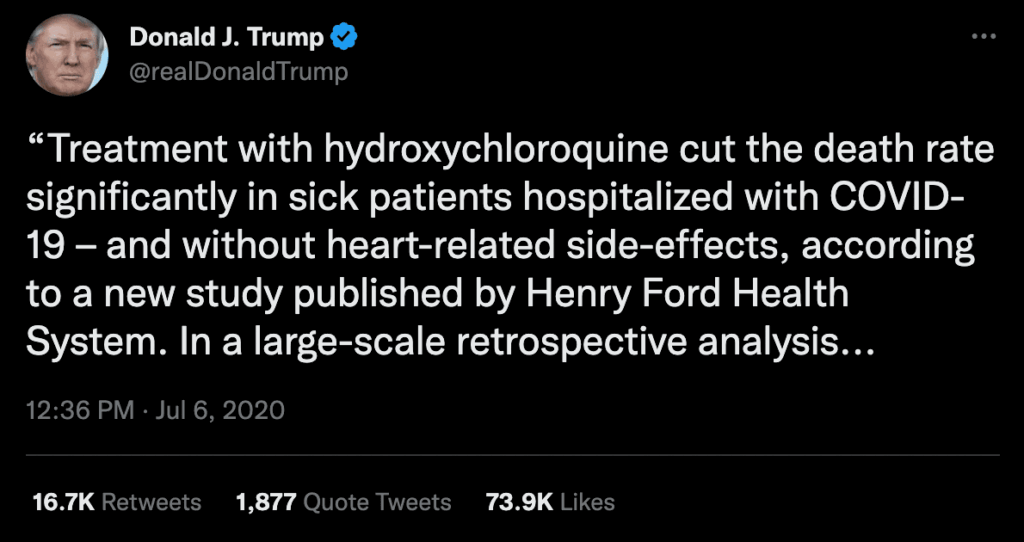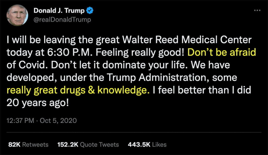 Questo è un elenco dei 26 (!) tweet in cui Trump ha cercato di dire all’umanità che non ha bisogno di un vaccino, perché esistono farmaci sicuri e molto efficaci.