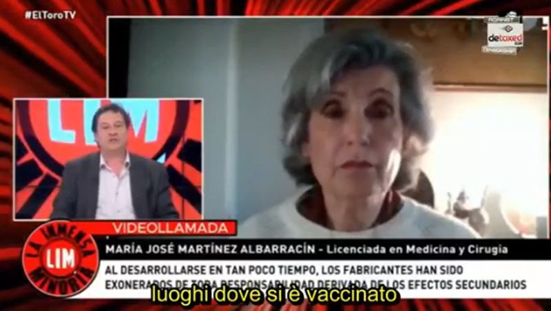 L’ultima a farlo è stata la dottoressa María José Martínez Albarracín, laureata in medicina e chirurgia presso l’Università di Murcia, professoressa di processi diagnostici clinici e membro dell’Associazione spagnola “Medici per la verità“, in un’intervista a El Toro TV, nel programma La Inmensa Minoría. Ciò che afferma la dott.ssa Martñinez Albarracín è estremamente preoccupante, poiché ritiene che entro il prossimo autunno, se il 70% della popolazione finisce per essere vaccinato, potremmo trovarci con la vera pandemia causata proprio da quella vaccinazione, e crede anche che possiamo arrivare alla morte del 30% delle persone che si sono vaccinate.
