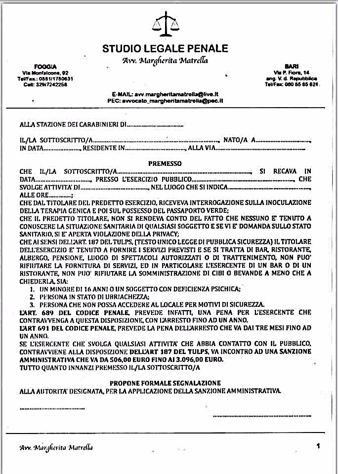 Ecco qui la denuncia precompilata per chi chiede il GREEN PASS