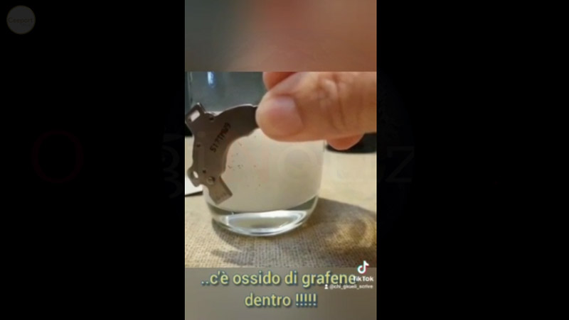 Fatto sta che in questo video si vede con chiarezza che avvicinando una calamita al bicchiere c’è qualcosa che comincia a muoversi verso la calamita. Qualsiasi cosa sia, la ingeriamo, nel video si parla di graphene, ma se non fosse, invitiamo a fare prove in laboratorio per chi ha le strumentazioni adatte, perchè vogliamo evitare allarmismi.