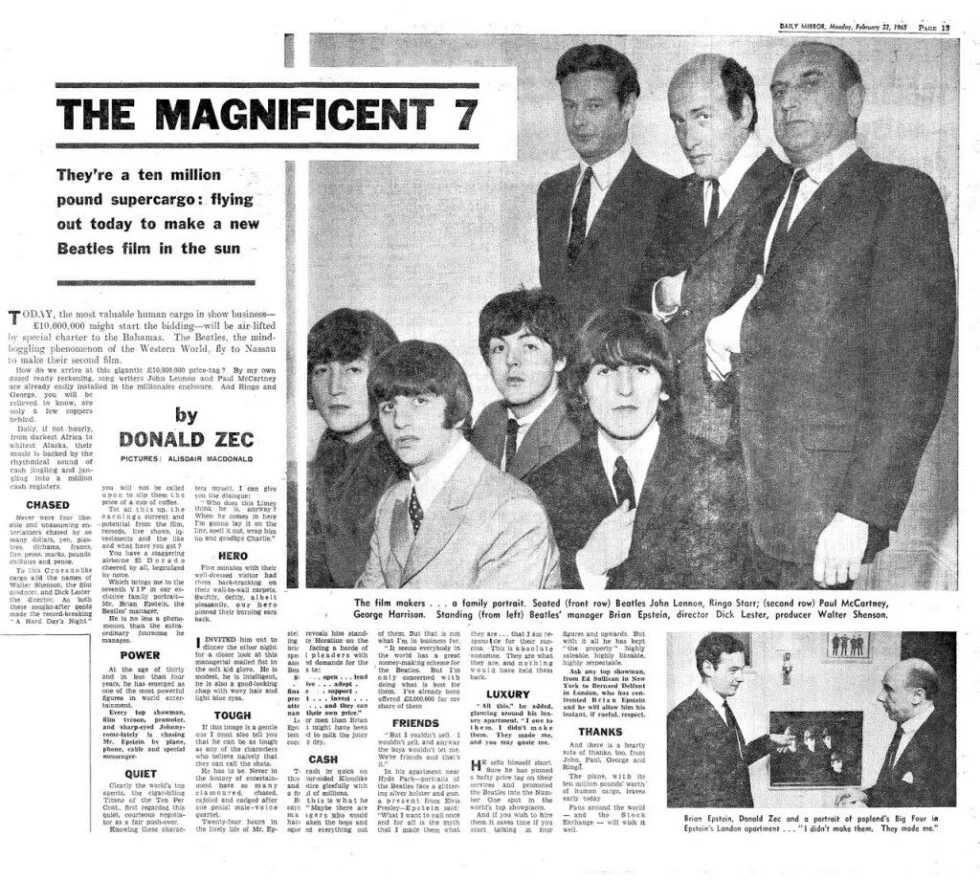 In un altro articolo del Daily Mirror del 22 febbraio del 1965 intitolato “I magnifici 7” dedicato ai quattro artisti e ai loro tre manager, oltre al citato Epstein ci sono anche Dick Lester Liebman, regista americano figlio di una famiglia ebraica originaria di Philadelphia, e Walter Shendon, anch’egli americano di origini ebraiche, ma di San Francisco.
