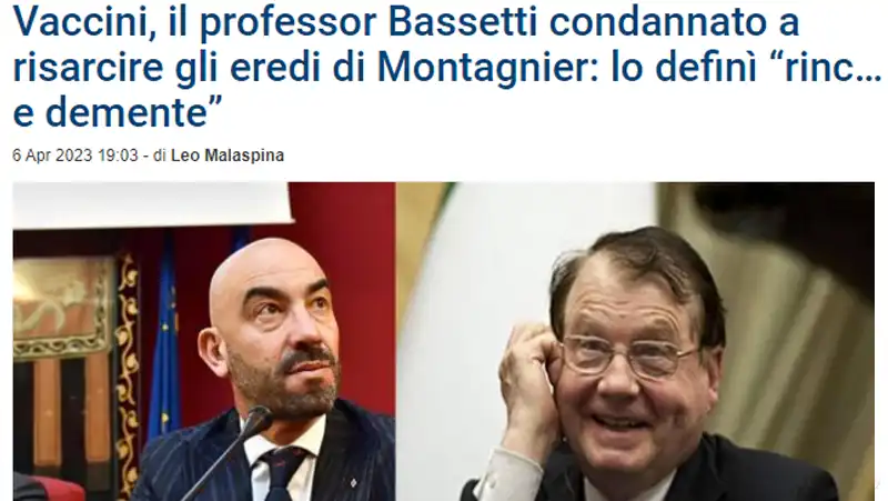 Come noto il Dr. Matteo Bassetti è stato condannato al risarcimento dei danni causati al Prof. Luc Antoine Montagnier per avergli rivolto in occasione di un suo incontro con il Sindaco di Sutri il 23 agosto 2022, frasi tipo vecchio rincoglionito asseritamente affetto da demenza senile.