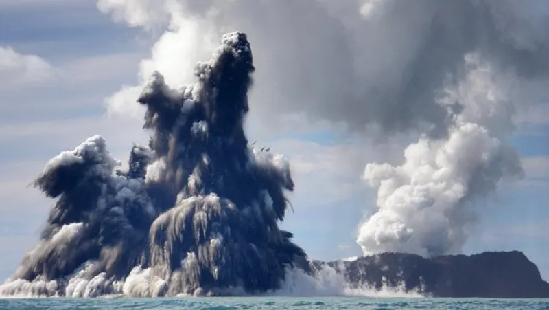 L’evento in questione è l’esplosione del vulcano sottomarino Hunga Tonga del 2022, che fece diventare rossi migliaia di ettari del circostante oceano Pacifico, per colpa dell’enorme quantità di cenere sulfurea eruttata e la conseguente crescita di un plankton rosso. Questo fenomeno fu talmente di vasta portata da essere osservabile dallo spazio.