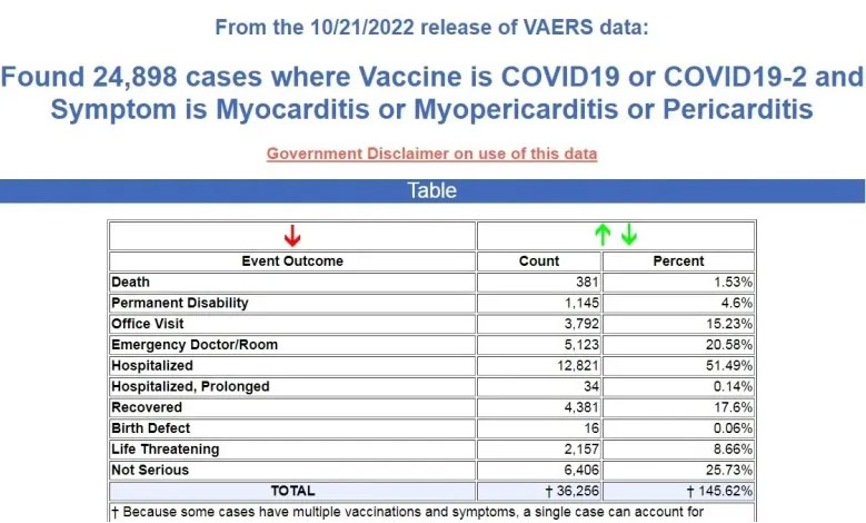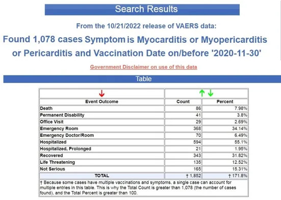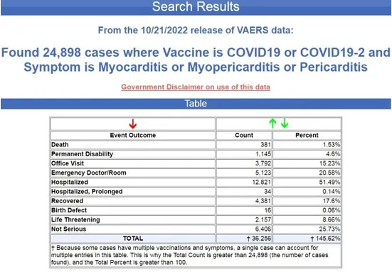 Ho preso le tre forme di malattie cardiache a cui ha fatto riferimento JAHA, che sono miocardite, pericardite e miopericardite, e ho cercato queste tre forme in VAERS in seguito ai vaccini COVID-19. La ricerca ha trovato quasi 25.000 casi, con 381 decessi, 1.145 disabilità permanenti, oltre 5000 visite al pronto soccorso e quasi 13.000 ricoveri. ( Fonte .)