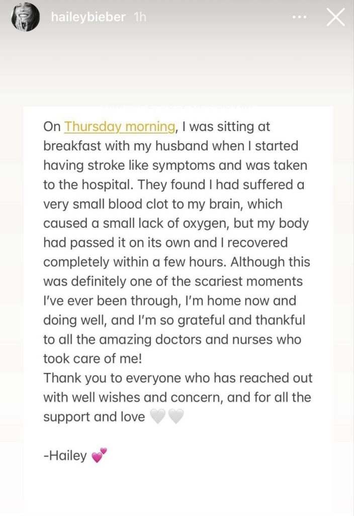 La top model Hailey Bieber, 25 anni, aveva condiviso sulla sua storia di Instagram la notizia del suo ricovero in ospedale.