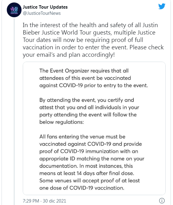 Justin Bieber ha sempre rispettato rigorosamente i protocolli Covid, ai fans infatti, richiedeva la prova di vaccinazione completa come requisito fondamentale per poter partecipare ai suoi concerti.