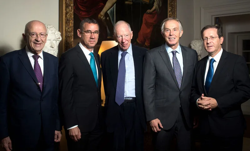 Al centro, Jacob Rothschild. Alla sua destra, Trevor Chinn, e alla sua sinistra, Tony Blair