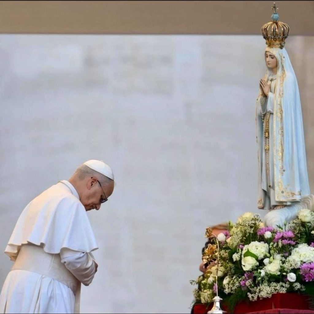 Papa Leone prega ai piedi della statua di Fatima