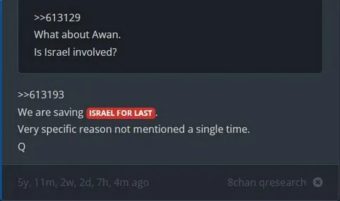 Si diceva prima che Q scrisse sulla sua bacheca che Israele andava lasciata per ultima.