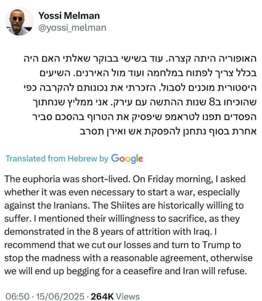 Yossi Melman, esperto militare israeliano afferma che la guerra in Iran è un grave errore