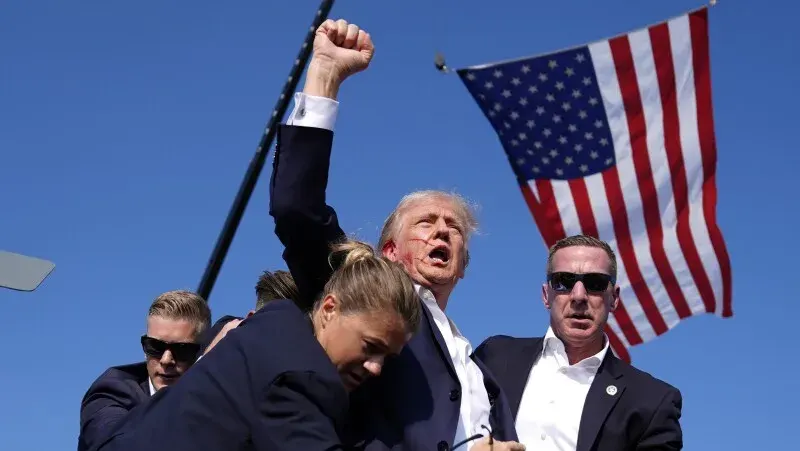 Il presidente si rialza e mostra il pugno alla folla in segno di vittoria per essere sopravvissuto ad un tentativo di omicidio ai suoi danni, non di certo il primo, e viene portato via dal servizio segreto.