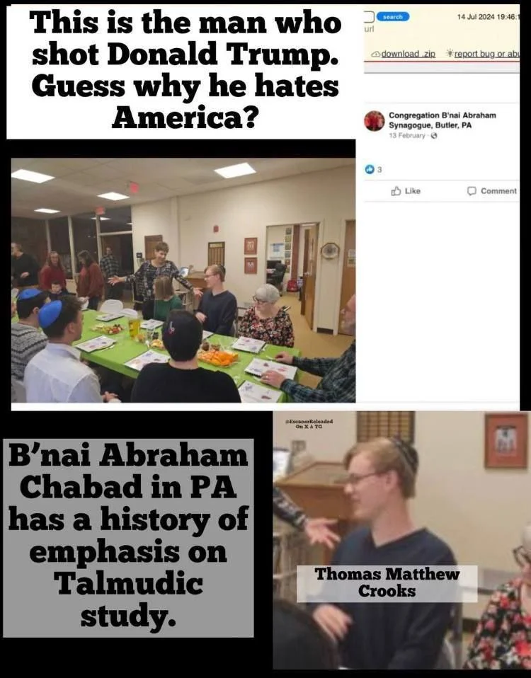 Non appena le foto di Crooks nella sinagoga di Butler hanno iniziato a diffondersi nella rete, la congregazione B’nai Abraham ha immediatamente rimosso le immagini dalla sua pagina Facebook nelle quali si vede Crooks, probabilmente perchè queste dimostravano un probabile collegamento tra i mandanti del tentato assassinio di Trump e i luoghi frequentati dal giovane 20enne americano.