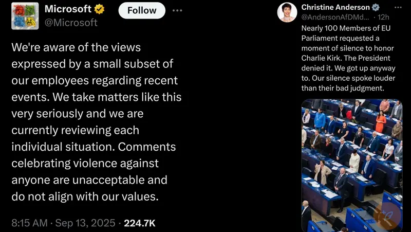 “Quasi 100 membri del Parlamento europeo hanno chiesto un minuto di silenzio per onorare Charlie Kirk. Il presidente lo ha negato. Ci siamo alzati comunque. Il nostro silenzio ha parlato più forte del loro cattivo giudizio.”