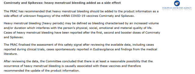 Il 28 ottobre 2022, l’EMA ha pubblicato una nuova guida che afferma che “il sanguinamento mestruale pesante e/o assente dovrebbe essere aggiunto alle informazioni sul prodotto come effetto collaterale dei vaccini mRNA COVID-19 Comirnaty (Pfizer) e Spikevax (Moderna)”.