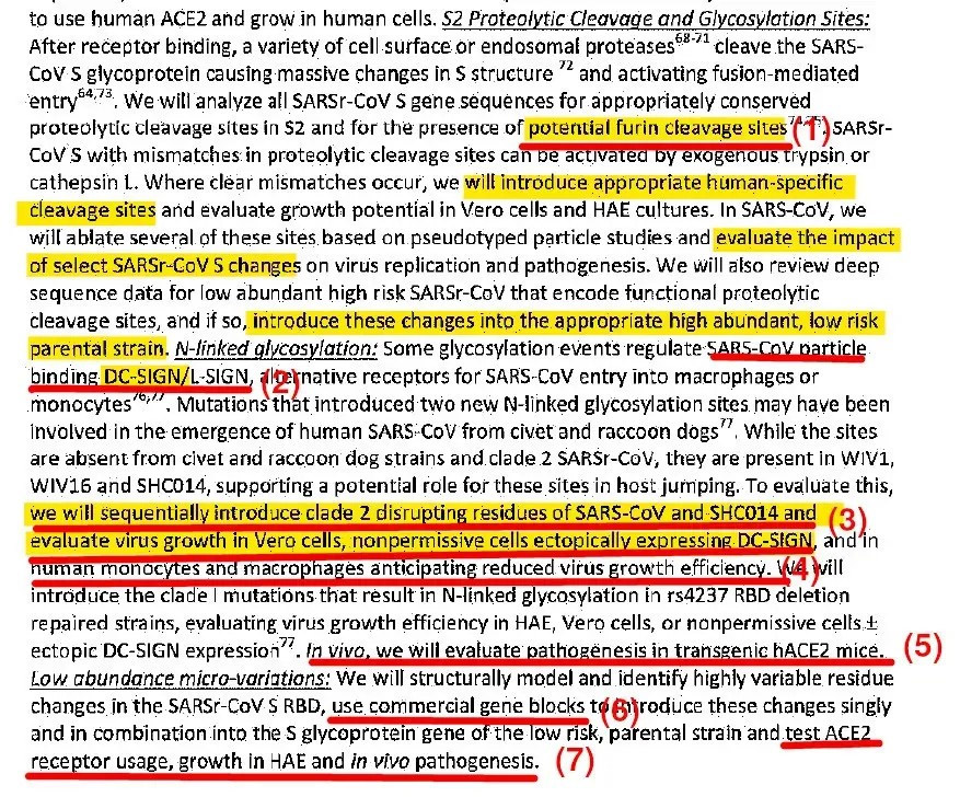 Sarebbe opportuno chiedere ai dottori Peter Daszak e Ralph Baric di EcoHealth quale fosse il motivo per aggiungere inserti di HIV al loro virus sperimentale per infettare le cellule immunitarie tramite DC-SIGN (un meccanismo indipendente da ACE2), descritto nella proposta DEFUSE 2018 qui: