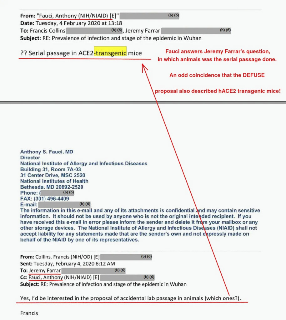 Sarebbe anche opportuno chiedere come il dottor Fauci, il 4 febbraio 2020, nel suo scambio di e-mail con il dottor Farrar e Francis Collins, sapesse che la Sars-Cov-2 era stata coltivata in topi transgenici ACE2 umanizzati: