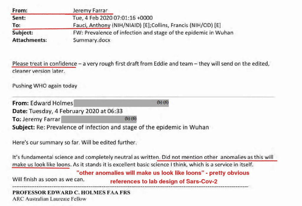 Lo stesso Jeremy Farrar, sempre il 4 febbraio 2020, era perfettamente a conoscenza delle ragioni per cui la Sars-Cov-2 aveva un “sito di scissione della furina”, dato che aveva inoltrato un’e-mail a Fauci chiedendo di tenerla segreta: