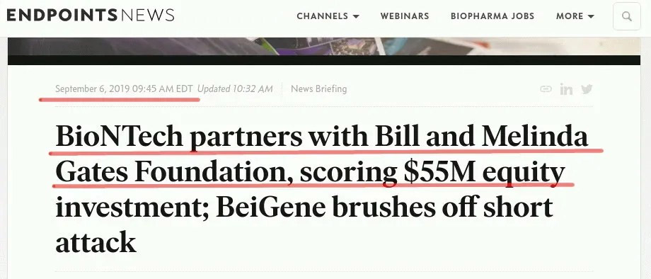 - La strabiliante coincidenza grazie alla quale la Fondazione Bill e Melinda Gates ha acquistato azioni di un’oscura startup BioNTech nel settembre 2019. BioNTech, fino a quel momento, non aveva mai prodotto alcun vaccino ma era destinata a diventare un “produttore di vaccini Covid” multimiliardario, producendo il famoso vaccino Pfizer. Un investimento così fortunato che ha prodotto un guadagno finanziario di 50 volte superiore per Bill.