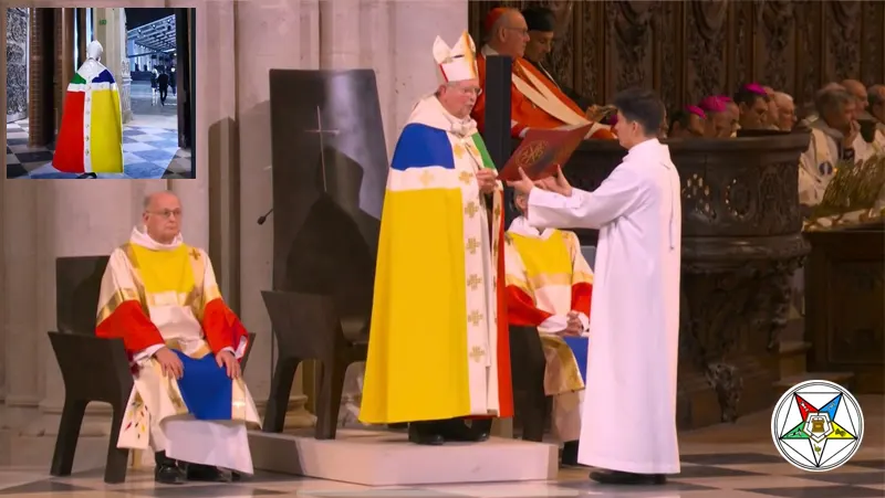 Queste sono le vesti cerimoniali dei ministri cattolici a Notre Dame, in occasione della cerimonia di inaugurazione della Cattedrale restaurata. Prima del fuoco, le loro vesti erano del canonico colore viola.