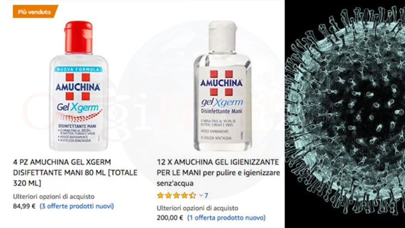 La psicosi da Coronavirus si porta dietro la follia dei prezzi alle stelle su alcune delle più famose piattaforme online. Su Amazon, ad esempio, il famosissimo gel disinfettante Amuchina è arrivato a costare 199,00 euro: il suo prezzo di listino è di circa 4 euro. La confezione da 5 pezzi di alcune mascherine con presunte speciali valvole “ideali per Coronavirus” sono vendute a 189 euro.