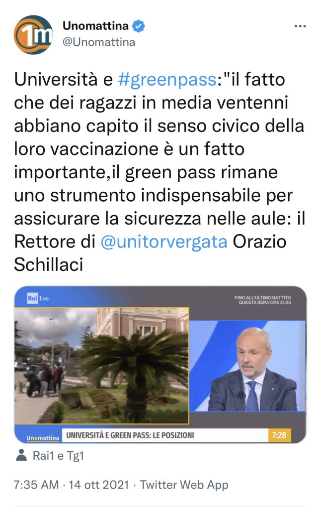 UniversitĂ e #greenpass:âil fatto che dei ragazzi in media ventenni abbiano capito il senso civico della loro vaccinazione è un fatto importante,il green pass rimane uno strumento indispensabile per assicurare la sicurezza nelle aule: il Rettore di @unitorvergata Orazio Schillaci