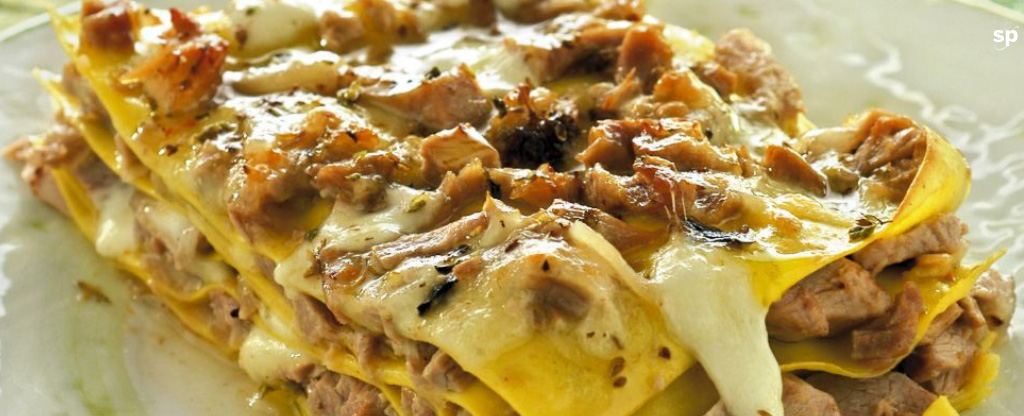 6) Ungete di olio una pirofila, sistemate sul fondo uno strato di lagane e ricopritelo con un po’ di sugo di capretto e qualche fettina di mozzarella; fate un altro strato di pasta e continuate così a strati fino a esaurire gli ingredienti.