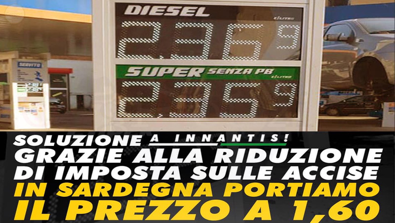 Ai sensi del novellato art. 10 del 2013 dello Statuto Sardo, modificato proprio per venire incontro alle richieste dei sardi in materia di agevolazioni fiscali, abbiamo potere sui 9/10 delle accise: ciò vuol dire che la Sardegna può applicare una detrazione di imposta che porterebbe il prezzo finale a calare drasticamente. Con la situazione d’emergenza economica questo provvedimento è più che mai necessario per garantire la sopravvivenza dell’isola. Calcolando una media del prezzo attuale di 2,45€ al litro, una volta decurtate le accise di 9/10 si arriva a 1,793€. La differenza di prezzo è 0,657. Su questa differenza va calcolata una decurtazione del 22% di Iva, che non incide più sul prezzo finale.