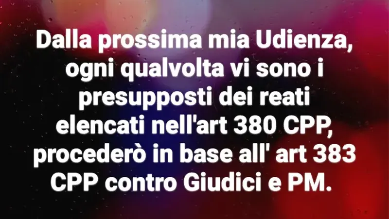 Visto e considerato che spesso nelle UDIENZE che mi vedono coinvolto, senza che vi sia una specifica ordinanza da parte del Procuratore Generale, sono presenti in aula di Udienza tantissimi Carabinieri, Polizia e Digos (non si sa chi abbia dato l’ordine) nei giorni antecedenti all’ udienza farò un video per informarvi che se in tale Udienza il Giudice o il Pm continueranno a commettere reati previsti dall’ art 380 CPP per proteggere criminali TRA CUI COLLEGHI MAGISTRATI permettendo finanche ai testimoni di dichiarare palesemente il falso per alterare il procedimento Penale e continuare a perseguitarmi con stalking giudiziario, PROCEDERÒ ALL’ ARRESTO DEI MAGISTRATI IN BASE ALL’ ART 383 CPP con i poteri conferitomi anche dalla sentenza della Corte Costituzionale n° 89 del 1970 che da la qualifica di agente di polizia giudiziaria al cittadino che applica il 383 CPP con tutte le responsabilità che sono previste in capo al Pubblico Ufficiale. Tale video oltre a essere pubblicato il tutti i social, sarà inviato prima dell’ udienza a tutte le autorità del luogo ove avverrà l’udienza, ovvero QUESTORE e Digos, Procuratore Generale, Presidente del Tribunale, Comandanti Provinciali di Carabinieri e Guardia di Finanza. Così invece di avere l’udienza per ultima di tutte le udienze per non esservi presenti testimoni e con presenti solo agenti su ordine illecito e non scritto dei magistrati criminali, l’udienza anche se per ultima, vedrà la presenza di altre forze dell’ Ordine e del pubblico che puntualmente ci portiamo da casa per evitare che in Aula si inventano aggressioni o reati contro di me per continuare a perseguitarmi con calunniose accuse. Questo varrà sia per le udienze aperte al pubblico e sia per le udienze in camera di consiglio. Vedremo se la mafia massoneria e servizi segreti al servizio del regime continuerà a farmi apparire come un Criminale o Violento al sol fine di tentare di ammazzarmi o farmi condannare o incarcerare da innocente per aver osato denunciare Sistemi Mafiosi anche all’ interno delle Istituzioni Italiane. QUANDO IL GIOCO SI FA DURO SOLO I DURI INIZIANO A GIOCARE… CHE SI DIA INIZIO AI GIOCHI… Vedremo chi si stanca per primo. Anche perché, solo per il fatto di denunciarmi calunniosamente di aver interrotto l’udienza o oltraggiato i magistrati mettendoli in arresto, l’intero procedimento Penale ex Art 11 dovrà essere trasferito per legge alla Procura competente ex Art 11 sia che sia io la persona offesa (qualora le Forze dell’ordine ottemperino a redigere verbale di arresto e prendere in consegna gli arrestati) e sia che le persone offese siano i magistrati (qualora le Forze dell’ordine presenti invece di redigere verbale di arresto e prendere in consegna gli arrestati procedano contro di me con violenza e calunniose accuse al fine di non ottemperare ai loro compiti ed eseguire gli ordini emessi da un magistrato posto in arresto). Francesco Carbone Presidente dell’Associazione Governo del Popolo APS.