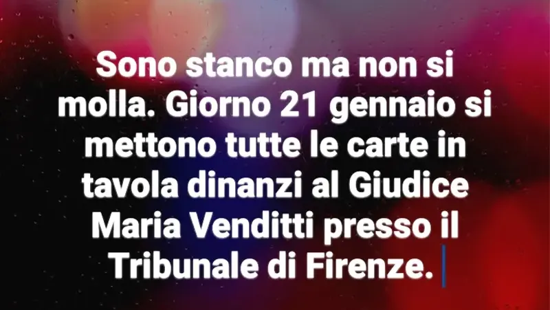Giorno 21 gennaio 2025 sarà l’ultima Udienza al Tribunale di Firenze dinanzi il Giudice Maria Venditti sia che si presentino o meno come testimoni il Procuratore Capo di Perugia Raffaele Cantone, la vice dirigente della Digos di Perugia e l’ex Questore di Perugia, in quanto la persecuzione ai miei danni sia fisica, economica e giudiziaria, il sabotaggio e il Depistaggio di denunce, il favoreggiamento e concorso ai Sistemi Criminali di Tipo Mafioso che hanno attentato alla mia vita, sequestrandoci, rapinandoci è già stato dimostrato con prove chiare precise e concordanti valutate dalla Corte di Appello di Roma IV sezione penale Presidente Francesco Neri. Al Procuratore Capo Spiezia che ha cercato di sabotare anche le NOTIZIE DI REATO inviate dalla Corte di Appello di Roma, è stata annullata la nomina di Procuratore Capo. Vedremo nel frattempo cosa farà il nuovo Procuratore Capo ad Interim o nominato, e se nulla farà entro il 21 gennaio, tutto il fascicolo dovrà essere inviato alla DDA di Genova dal Giudice Maria Venditti oltre ad assolvermi dalle calunniose accuse da parte del Procuratore Capo di Perugia Raffaele Cantone e dalla Digos di Perugia. È fondamentale, come sempre, una massiccia presenza del Popolo in tale udienza visto che i media di Regime non ne danno alcuna notizia pur essendo un processo in cui è stato dimostrato come opera il CORPORATIVISMO CRIMINALE DI TANTI MAGISTRATI IN TANTI TRIBUNALI D’ITALIA, UTILIZZANDO COME SCAGNOZZI, MERCENARI, KILLER, SCIACALLI, TANTI INFEDELI DELLE FORZE DELL’ ORDINE per cercare di annientare chi denuncia Sistemi Criminali di Tipo Mafioso.
