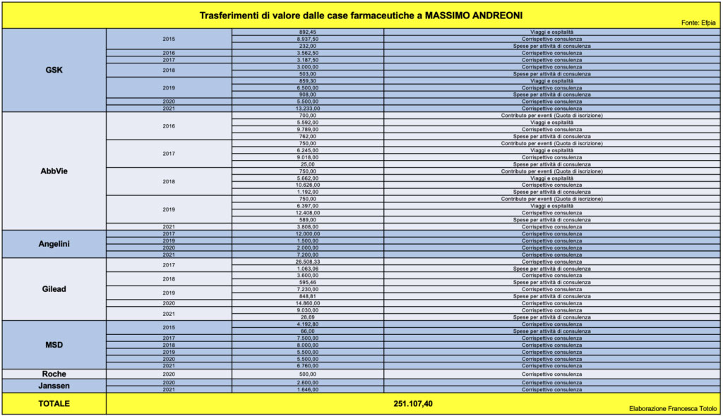 Il professor Massimo Andreoni, primario di Infettivologia al Policlinico Tor Vergata di Roma e direttore scientifico della Società italiana di malattie infettive e tropicali, è stato uno degli infettivologi più presenti nei salotti televisivi durante la campagna vaccinale anti Covid. Dal 2015 al 2021, per attività di consulenza e congressi, Andreoni ha ricevuto un totale di più di 251mila euro dalle case farmaceutiche.