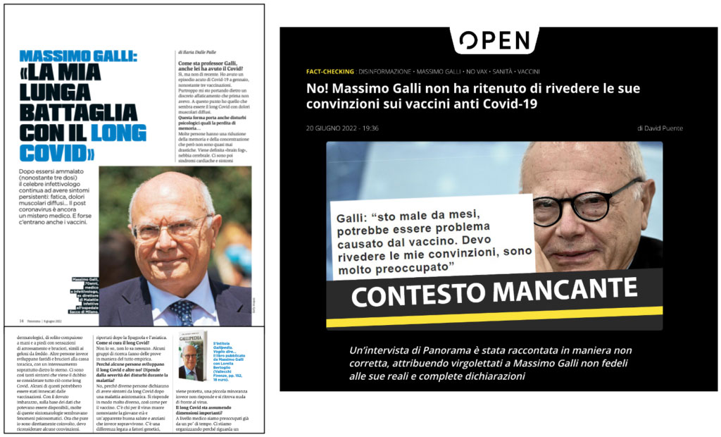 Il professor Massimo Galli, ex primario del reparto di malattie infettive dell’Ospedale Sacco di Milano, ha reso noto di aver contratto il Covid-19 durante i festeggiamenti del Capodanno 2021, nonostante la somministrazione di tre dosi di vaccino. Curato con i monoclonali, ha sperimentato per diversi mesi i sintomi del long Covid. In un’intervista a Panorama, ha dichiarato: “Ci sono così tanti sintomi che viene il dubbio se considerare tutto ciò come long Covid. Alcuni di questi potrebbero essere stati innescati dalle vaccinazioni (…) Ora che pure io sono direttamente coinvolto, devo riconsiderare alcune convinzioni”. Questa affermazione ha generato poi una serie di polemiche e un disperato tentativo di smentita di alcune testate.
