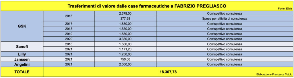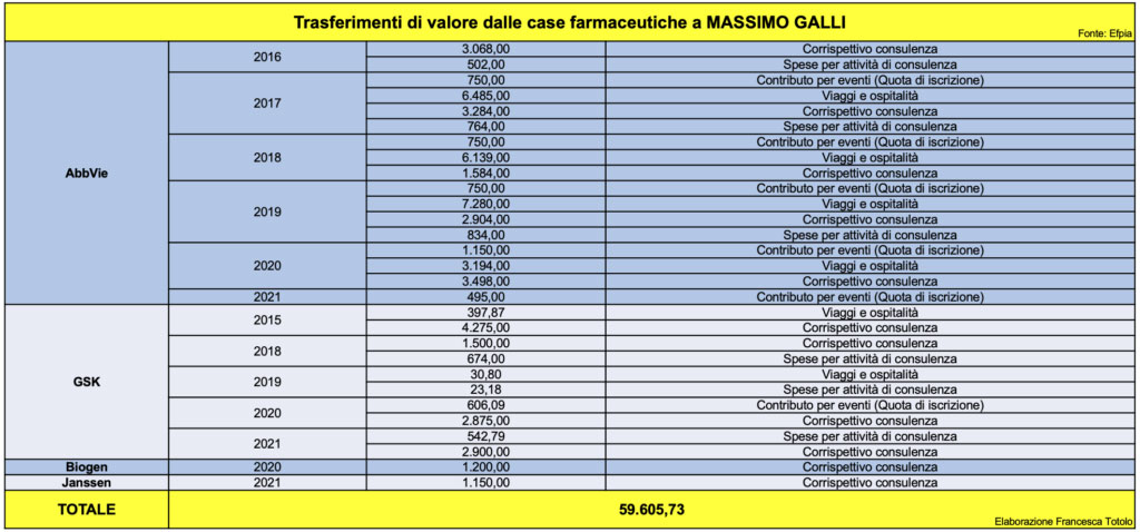 Nel 2021, il professor Galli ha continuato a collaborare con tre case farmaceutiche, AbbVie, GSK e Janssen. Da quando la pubblicazione dei codici di trasparenza è obbligatorio, l’ex primario del Sacco ha intrattenuto rapporti economici con l’industria del farmaco per un totale di quasi 60mila euro.