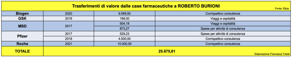 Nel 2021, Burioni è stato ingaggiato dalla Roche per una collaborazione da 10mila euro. Nel 2018, la Pfizer gli elargì per una consulenza 4.500 euro.