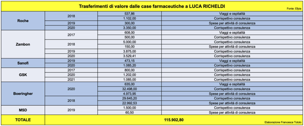 Anche il professor Luca Richeldi è stato membro del primo Comitato tecnico scientifico. Dal 2017 al 2021, ha intrattenuto rapporti economici con sei case farmaceutiche. Ciò gli ha permesso di guadagnare più di 115mila euro.