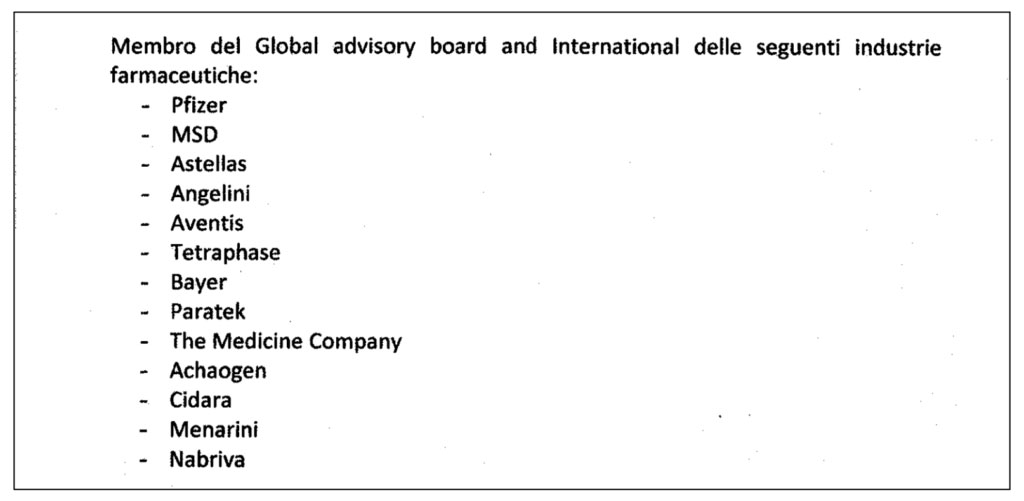 Il professor Matteo Bassetti si conferma il televirologo italiano più amato dalle case farmaceutiche. D’altronde, il direttore della Clinica malattie infettive del Policlinico San Martino di Genova è stato membro del “Global advisor board and International” di alcune case farmaceutiche, tra queste anche la Pfizer, come da lui stesso dichiarato nel curriculum aggiornato al 10 marzo 2018. Bassetti ha poi rassicurato che non ci sono stati conflitti di interessi perché la sua attività di consulenza riguardava solo “il settore antibiotici”. Risulta per questo motivo particolare che il suo ruolo come advisor delle case farmaceutiche sia sparito dal curriculum di Bassetti aggiornato al 18 luglio 2021.