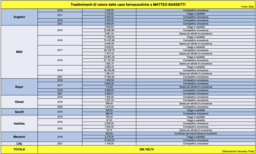 Dal 2015 al 2021, i trasferimenti di valore dalle case farmaceutiche a Matteo Bassetti sfiorano i 400mila euro.