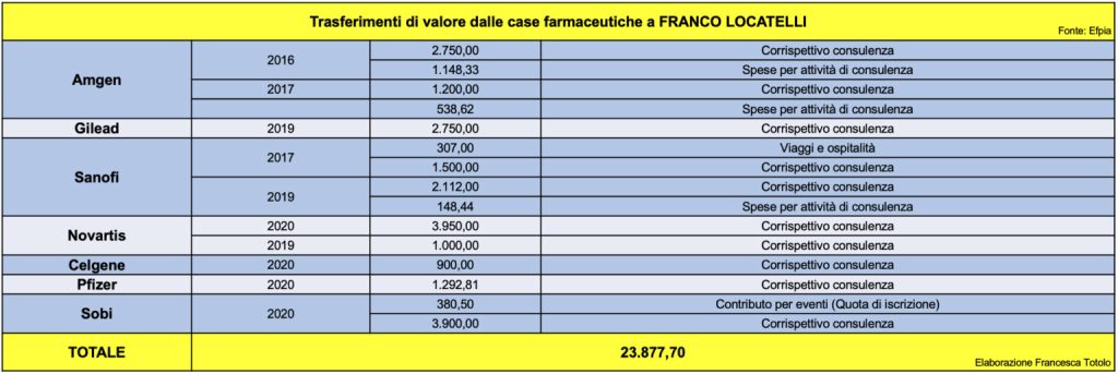 Analizzando i nuovi codici di trasparenza, si evince che Locatelli non ha avuto alcun nuovo rapporto economico con le case farmaceutiche nel 2021.