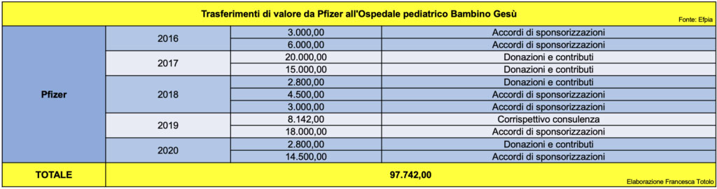 Per ampliare l’indagine, abbiamo esaminato ulteriormente gli Efpia di Pfizer, controllando se esistessero dei trasferimenti di valore intercorsi tra la casa farmaceutica e l’Ospedale Bambino Gesù, dove Locatelli è direttore del dipartimento di Onco-Ematologia pediatrica e terapia cellulare e genica. Diversi medici di quell’ospedale pediatrico, anche con video pubblicati sulla pagina Facebook ufficiale, sono stati in prima linea nel consigliare ai genitori di vaccinare i propri figli. Dal 2016 al 2020, Pfizer ha erogato un totale di 97.742 euro al Bambino Gesù per accordi di sponsorizzazione, in donazioni/contributi e consulenze. Nel 2021, questi regolari trasferimenti di valore si interrompono.