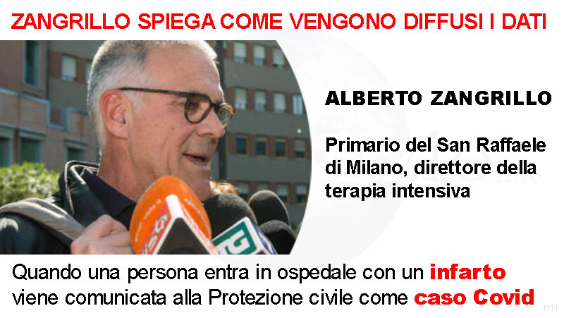 «Io oggi leggo ancora 44 morti in Italia», continua Zangrillo. «Quando una persona entra in ospedale con un infarto del miocardio, si fa un test per capire se sia o meno positivo al Covid. Ma nel frattempo la situazione clinica precipita, entra in sala chirurgica ma non ce la fa. Purtroppo dopo due giorni muore. Questa persona viene comunicata alla Protezione civile come caso Covid. Questa persona aveva il Covid ma è morta di tutt’altro».