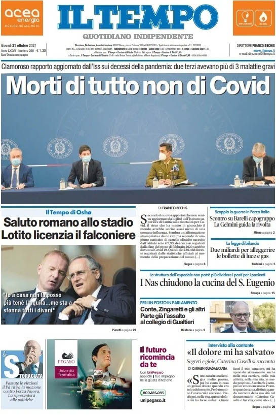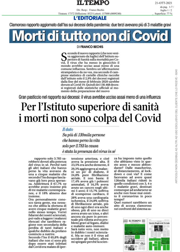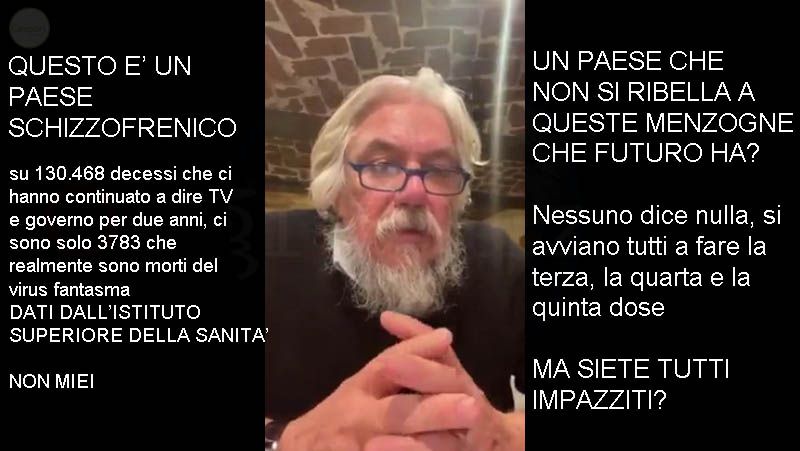 ISS ha ammesso che i 130.468 morti a causa del virus, in realtà sono circa 3.783 “il 2.9%”, i restante 97% è morto a causa di malattie pregresse “da una a 5 malattie pregresse”. Questo smantella la narrazione terroristica che siamo costretti a subire da circa due anni. E ancora oggi dopo questa clamorosa notizia, non c’è nessun TG che ne parla, anzi continuano a tenere sotto scacco un paese intero.