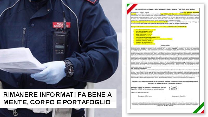 Alcuni pensano che non ci sia bisogno di questa autodichiarazione, in quanto tutto quello che è all’interno puoi usarlo per difenderti in tribunale, noi pensiamo che sarebbe in ogni caso civile avvertire il verbalizzante a cosa può andare incontro, tenendo conto che inconsapevolmente stanno eseguendo ordini illegittimi e il più delle volte li eseguono solo per non avere rogne con i loro comandanti, quindi è doveroso da parte nostra metterli al corrente che il rischio di una denuncia è assai più grave.
