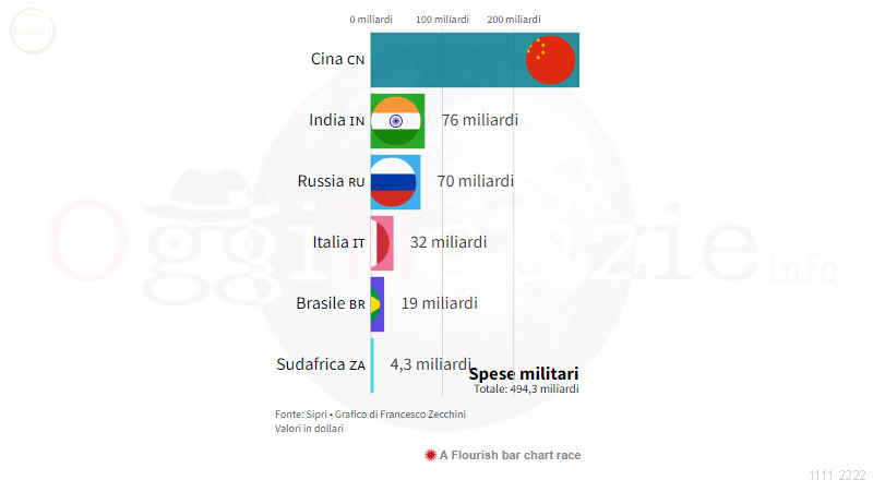 Nessun Paese al mondo, com’è noto, ha una spesa militare minimamente paragonabile a quella degli Stati Uniti, che secondo i dati del Sipri di Stoccolma, nel 2021 hanno speso per il comparto circa 800 miliardi di dollari, pari al 3,2% del loro Pil (che è il più alto al mondo). La Cina, primo Paese fra i Brics in questa classifica, ha speso nello stesso periodo 293 miliardi di dollari (pari all’1,7% del suo Pil). Seguono l’India, con 76 miliardi (2,7% del Pil), la Russia (70 miliardi pari al 3,1% del Pil), il Brasile (19 miliardi) e il Sudafrica, che con i suoi 4,3 miliardi spesi non è neanche fra i primi 20 Paesi al mondo (tra i quali, per intenderci, c’è anche l’Italia all’11esimo posto).
