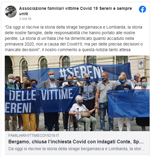 «Da oggi si riscrive la storia della strage bergamasca e lombarda, la storia delle nostre famiglie, delle responsabilità che hanno portato alle nostre perdite. La storia di un’Italia che ha dimenticato quanto accaduto nella primavera 2020, non a causa del Covid-19, ma per delle precise decisioni o mancate decisioni». Dopo 3 anni di indagini, la procura ha individuato delle responsabilità precise nella gestione della primissima fase della pandemia. «Da sempre ci siamo battuti per la verità per i nostri cari – continuano gli esponenti del direttivo dell’associazione – nonostante l’omertà che ha sempre contraddistinto questa storia. Siamo andati avanti senza mai scoraggiarci nel percorso di memoria e di giustizia, confidando nella magistratura». Una decisione che «non ci restituisce i nostri cari e non cancella le lacrime che abbiamo versato, ma onora la memoria di chi ha pagato in prima persona. A noi che restiamo dà la forza per continuare a combattere con ancora più determinazione le nostre battaglie: quelle della memoria e della difesa della dignità della vita e della morte, perché il sacrificio dei nostri cari non sia vano e mai più una pandemia o una qualsivoglia emergenza ci trovi così impreparati», conclude la nota dell’associazione che si è fatta difendere da un pool di legali, gli avvocati Consuelo Locati, Alessandro Pedone, Luca Berni, Giovanni Benedetto e Piero Pasini.