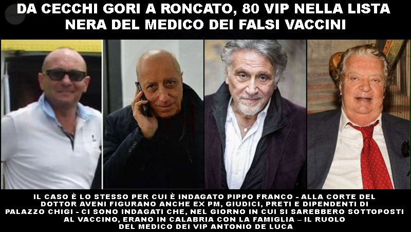IL CASO È LO STESSO PER CUI È INDAGATO PIPPO FRANCO – ALLA CORTE DEL DOTTOR AVENI FIGURANO ANCHE EX PM, GIUDICI, PRETI E DIPENDENTI DI PALAZZO CHIGI – CI SONO INDAGATI CHE, NEL GIORNO IN CUI SI SAREBBERO SOTTOPOSTI AL VACCINO, ERANO IN CALABRIA CON LA FAMIGLIA – IL RUOLO DEL MEDICO DEI VIP ANTONIO DE LUCA